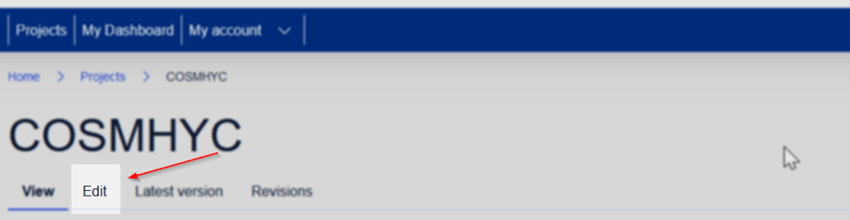 Bellow you can find an example of the Edit action for a project page which in this case is available to the Project Officer role. Similarly, if your account has the required permissions, you can find the Edit action to other pages like Research object pages, and Research object instance pages.