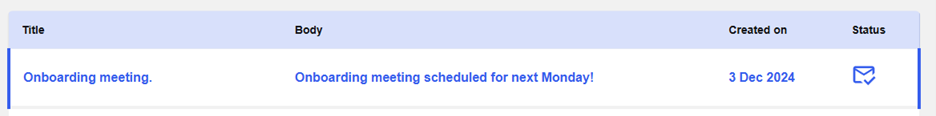 The notifications table is showing the full list of platform notifications received and are order by descending date. The notifications messages will remain in “Unread” status until they are marked as read by clicking the “envelop” icon ![]()